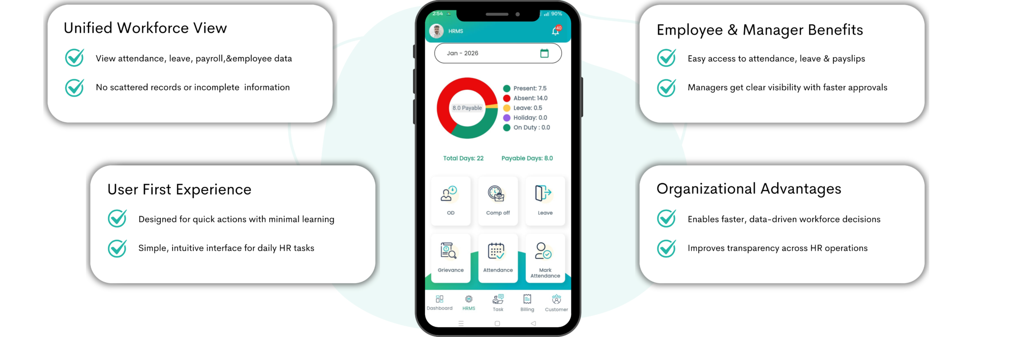 Manage attendance, leave, payroll, approvals, and employee records from one centralized platform