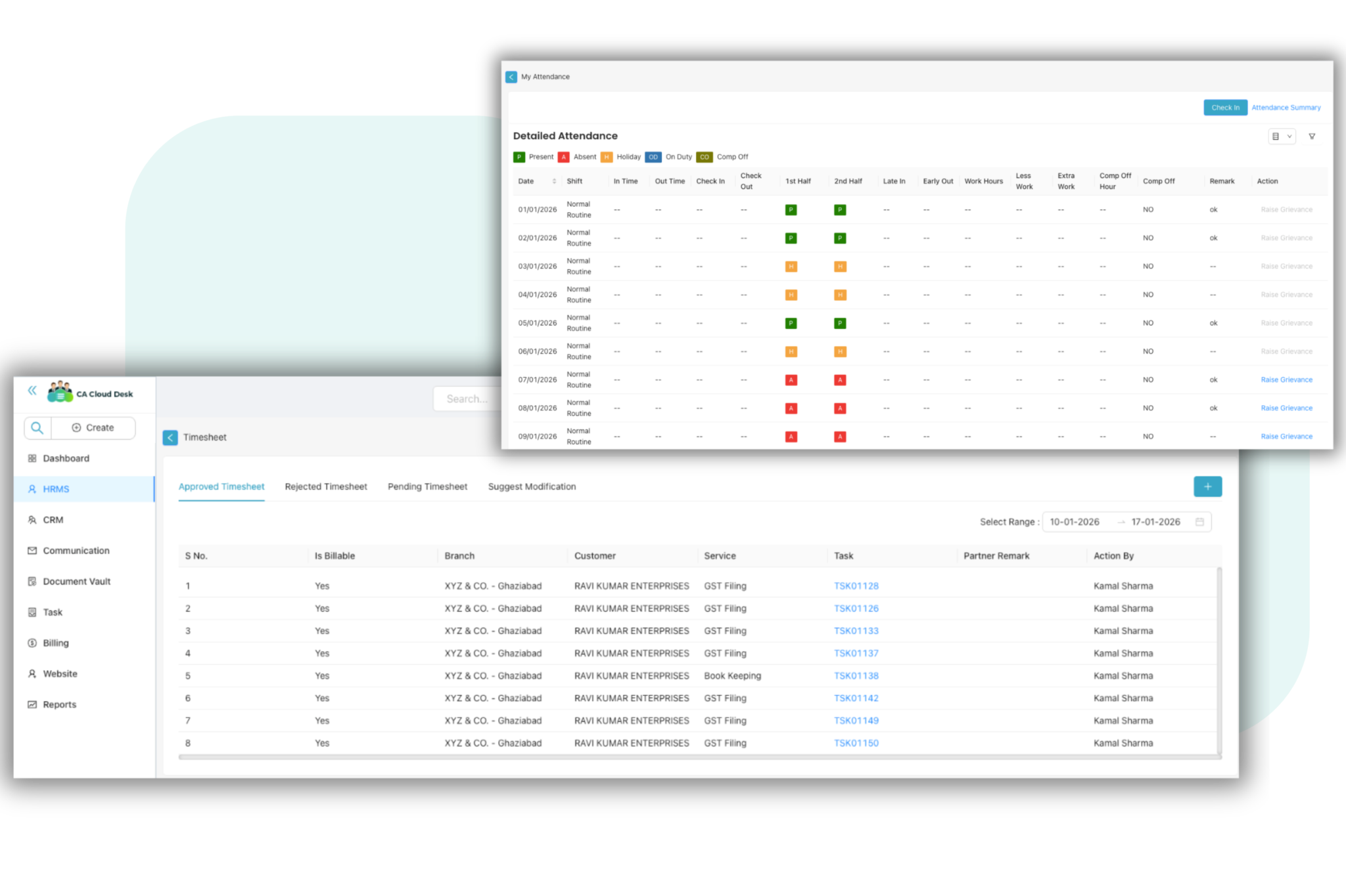 CA CloudDesk’s HRMS goes beyond basic employee management by bringing attendance, leave, payroll, task tracking, and team coordination into one unified platform. Built with enhanced HR intelligence, it offers real-time insights, role-based access, and automated workflows tailored for professional firms.